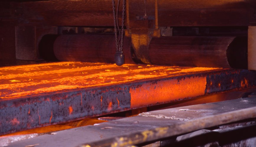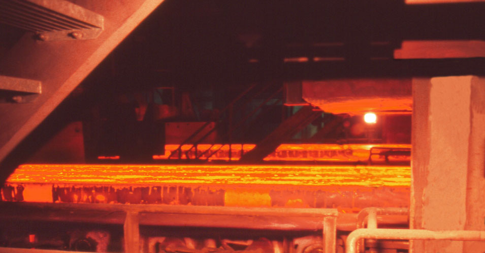 After many development stages, in which SMS Demag played a significant role in shaping and advancing, the current state of the art is hydraulically driven resonance oscillation. At ThyssenKrupp Steel AG in Duisburg-Bruckhausen, a hydraulically operated short-lever oscillation from SMS Demag AG is in use. In the mould, the rectangular strand, which is liquid inside and solidified on its surface, is formed from the molten steel flow. The subsequent strand guide supports the strand. The strand is completely solidified under spray water cooling. This strand guide consists of 13 groups of rollers, the so-called segments, which fulfil several tasks: They prevent the bulging of the steel strand to a dimension greater than a defined thickness of 215 mm with a width of 1,800 to 2,600 mm. And they align the strand from the vertical to the horizontal – with a radius of 9.3 m. In addition, they enable the cooling of the strand by water so that the steel flow is completely solidified when it is cut into slabs at the end of the casting machine.
