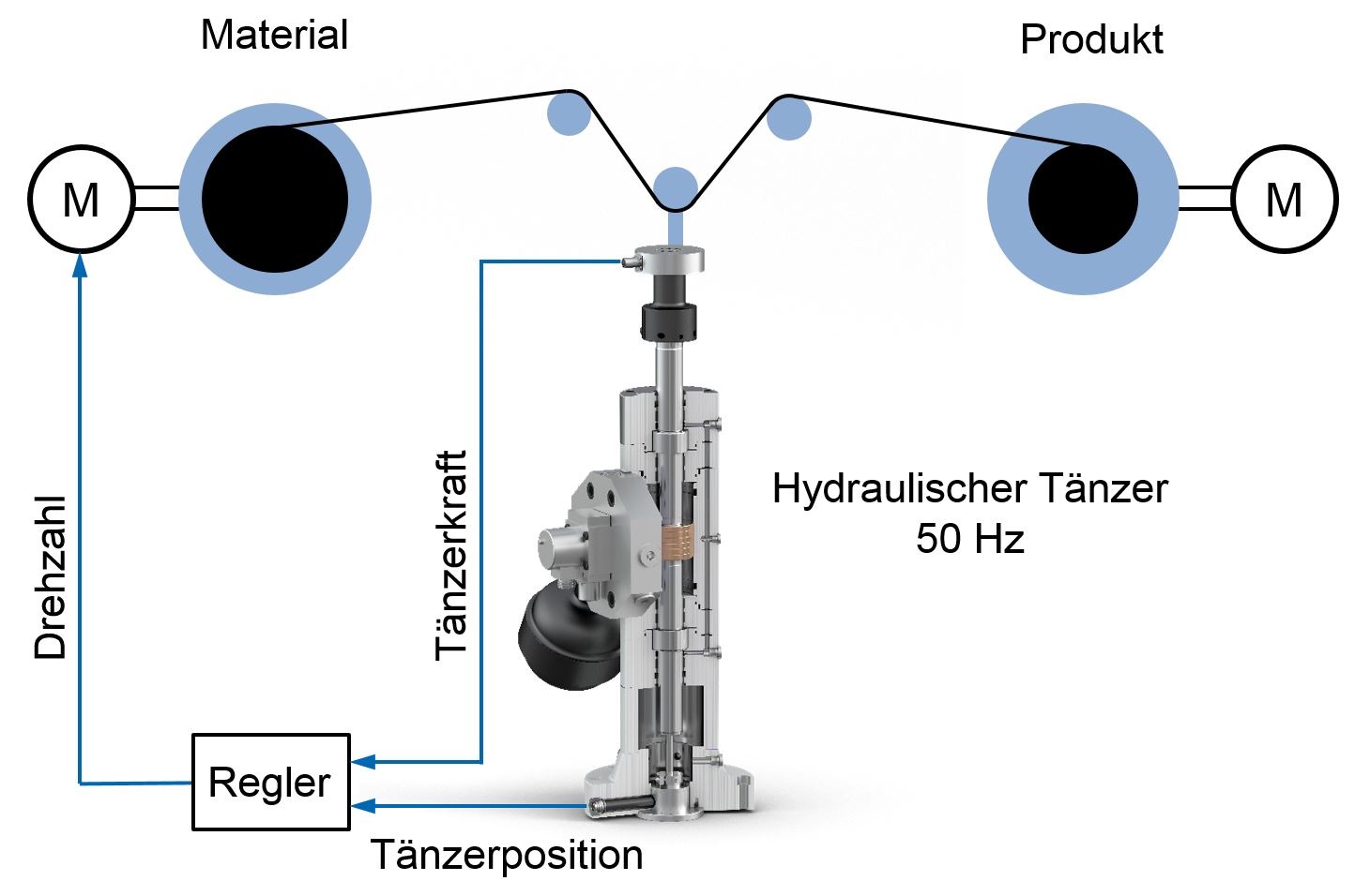 In winding and unwinding processes in textile machines, tearing of the fibre or tape during the unwinding or winding phase must be prevented. A vertically freely movable guide roller, the so-called dancer, is used. This regulates the preload of the winding material. The force retracting for the thread tension must always be constant. This is independent of different bobbin diameters, unwinding speed, possible material irregularities and other parameters.
